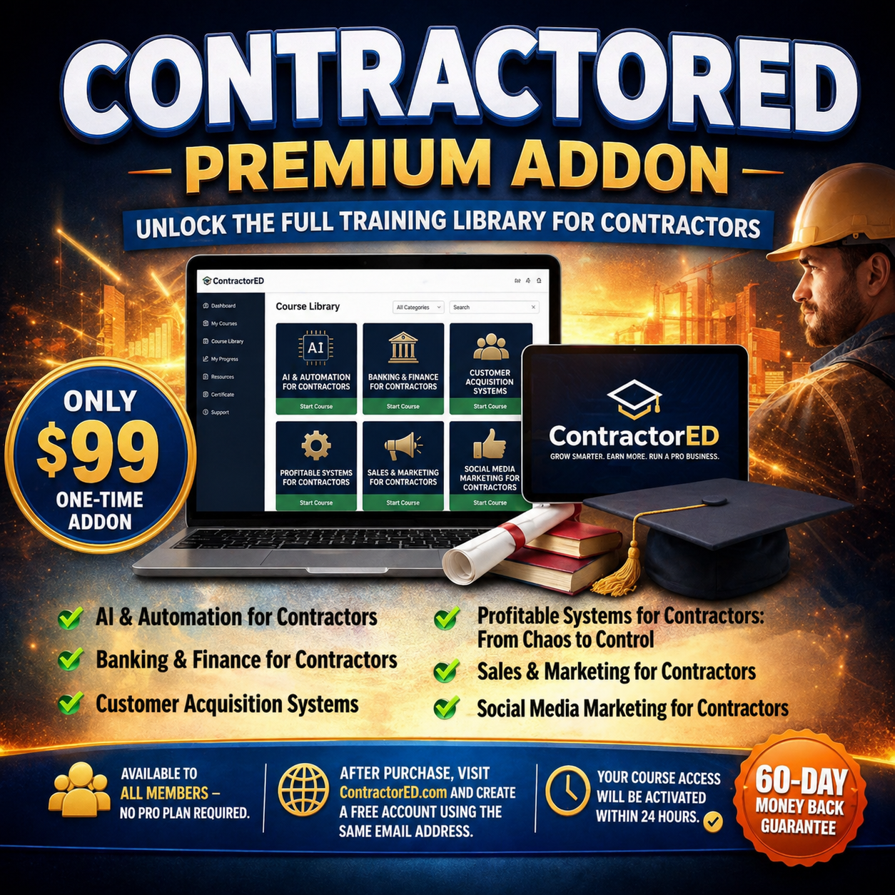 Get instant access to the ContractorED training library — built specifically for contractors who want to grow smarter, earn more, and run a professional business.